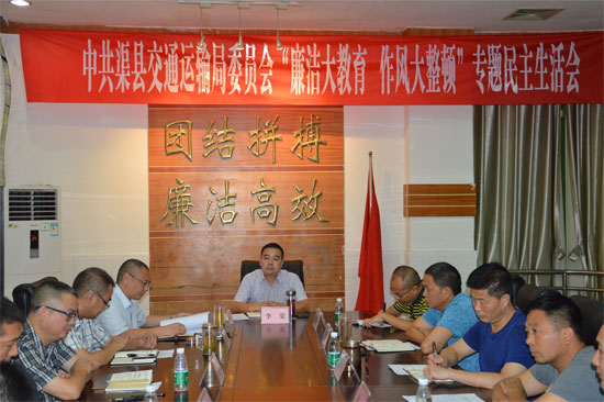 8月31日,渠县交通运输局党委召开“廉洁大教育、作风大整顿”专题民主生活会,局党委书记、局长申清勇代表县交运局党委班子成员作了对照检查,并带头作了自我剖析。渠县纪委常委、县监察局副局长隗银辉全程进行指导,县政府副县长李渠出席会议并进行了精彩点评,对县交运局党委下步工作提出要求。