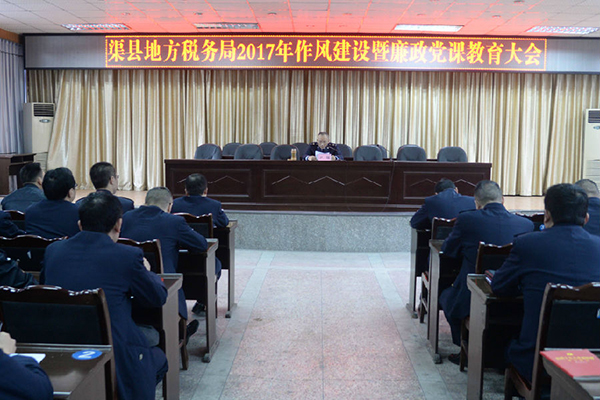 12月14日,渠县地税局召开作风建设暨廉政党课教育会议,该局党组书记、局长尹纲以《认清反腐形势坚守清廉品格 勇做渠县地税党风廉政建设标兵》为题,给全县地税系统200余名干部职工上廉政专题党课。